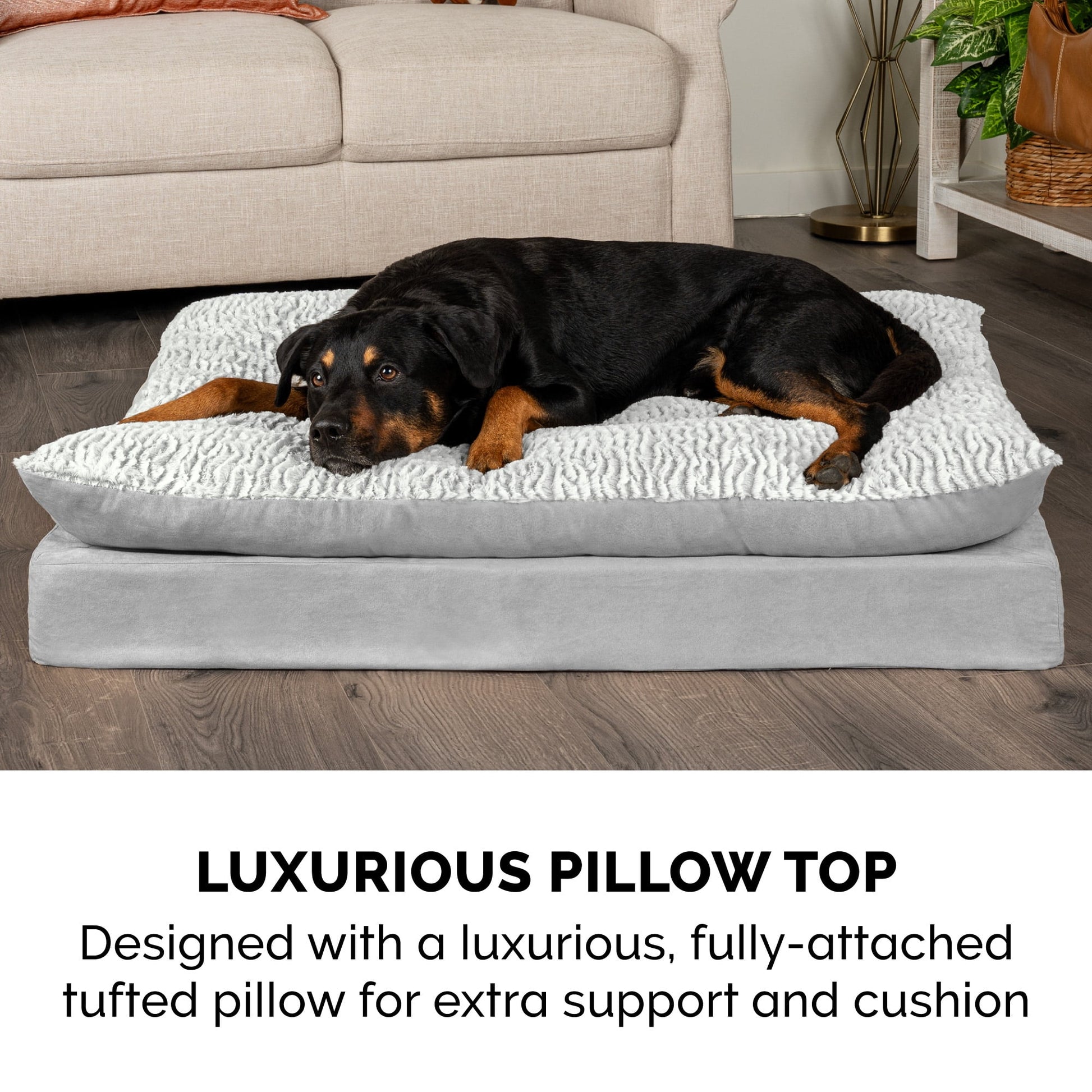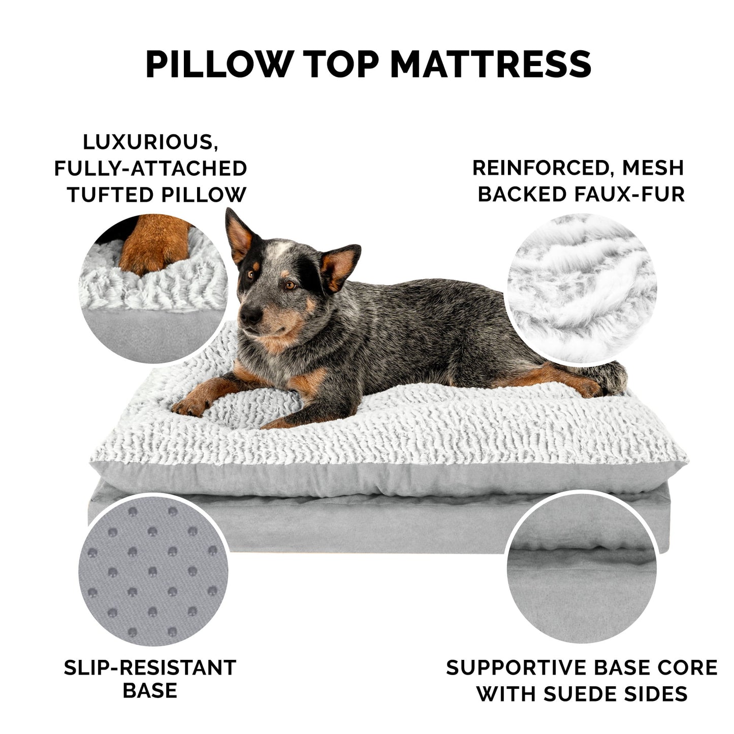 FurHaven's Embossed Faux Fur & Suede Pillow Top Dog Bed takes pet beds to a whole new level! Great for pets of all ages, this dog bed is designed with a fully attached fiberfill pillow atop a mattress base - providing an extra layer of high-loft cushioned support for ultimate lounging comfort. The tufted sleep surface is topped with luxuriously embossed faux fur that is gentle on noses and paws, paired with elegant and easy-care suede wrapped around the sides. The orthopedic foam base supports your pet's joints and pressure points, allowing for improved circulation and a better night's rest. Features a non-skid bottom base to keep the bed in place. Includes zippered access to the pillow top filling for easy refills and stuffing replacement. Easy to clean. Cover care: Remove base core before washing (see seam label for fabric care instructions). Foam care: Spot clean with mild soap; rinse. Blot, then air dry. Not for unsupervised use by animals with chewing behaviors. Not for unsupervised use by animals with chewing behaviors. Colors: Taupe Gray Dimensions: Medium – 30" x 20" x 3" Large – 36" x 27" x 3" Jumbo – 40" x 32" x 4"